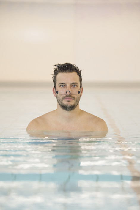 Optometrist David Urech trägt die Lesebrille von Rodenstock. Sie ist perfekt, aber nicht fürs Becken, sondern fürs Bett oder die Leseecke. Immerhin liess David Urech sich nicht davon abhalten, für das Foto vom Dreimeter zu springen.