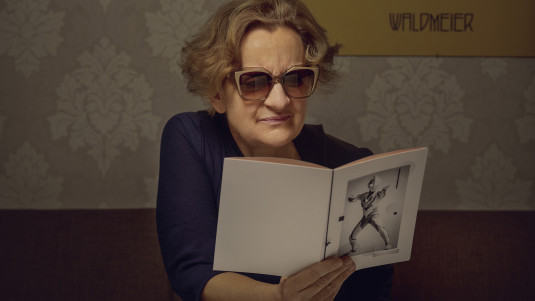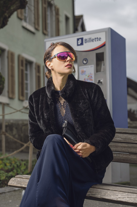 Optometristin Karin Urech, gekleidet für die Oper. Im wahren Leben würde sie die «Traileye» von Evil Eye auf ihrer Nase natürlich beim Sport aufsetzen und nicht auf dem Weg in die Oper. Dorthin würde sie eine extravagante Sonnenbrille wählen, die ihr elegantes Outfit unterstreicht.