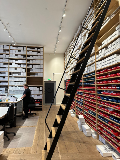 Im "Lager-Raum" sind tausende sorgfältig sortierte Brillenfassungen zu finden. Mitarbeiter:innen führen Qualitätschecks durch, da die Fassungen auf ihrem Weg von Japan nach Kopenhagen durch Wärme und Kälte beeinflusst werden. Diese Einflüsse müssen kontrolliert und gegebenenfalls korrigiert werden. Jede Orgreen-Fassung macht einen Zwischenstopp in Kopenhagen, bevor sie bei uns in Aarau eintrifft. Und bei uns stürzen sich gleich alle Mitarbeiter:innen auf die dänischen Ikonen.